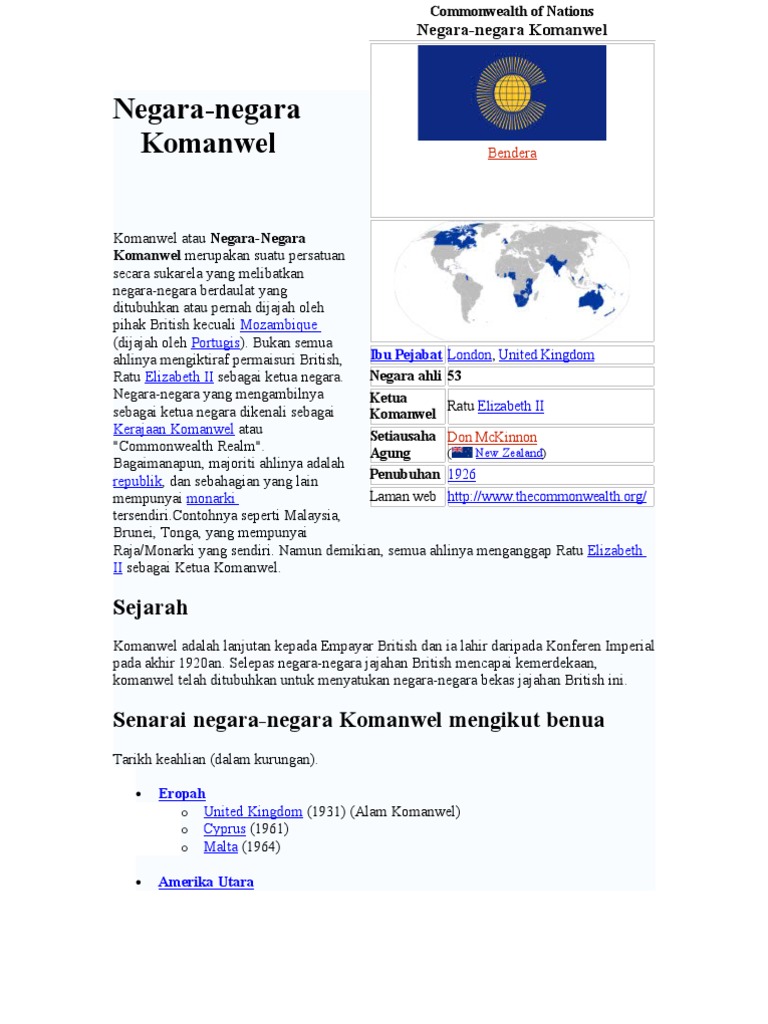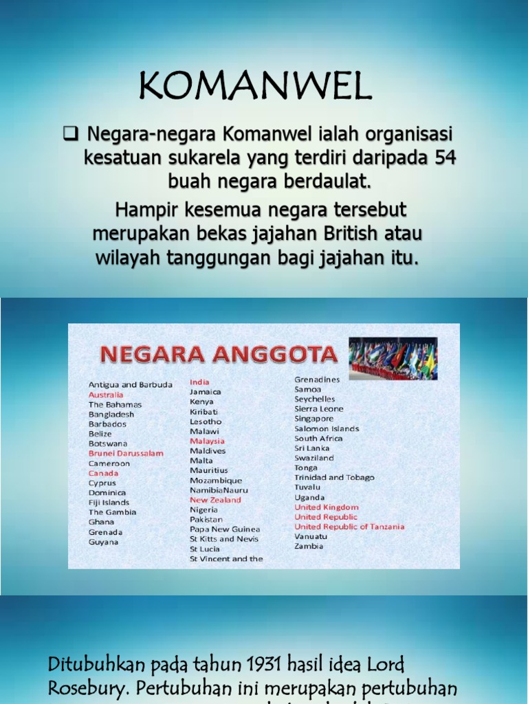 Bukan semua ahlinya mengiktiraf ratu british ratu elizabeth ii sebagai ketua negara. Negara negara komanwel atau komanwel sahaja merupakan satu persatuan secara sukarela yang melibatkan negara negara berdaulat yang ditubuhkan atau pernah dijajah oleh pihak british kecuali mozambique bekas jajahan portugis dan rwanda bekas jajahan belgium. Negara negara komanwel ialah organisasi kesatuan sukarela yang terdiri daripada 52 buah negara berdaulat. Sebelum disebut sebagai negara negara komanwel ia dikenali sebagai negara negara komanwel british british commonwealth of nations.