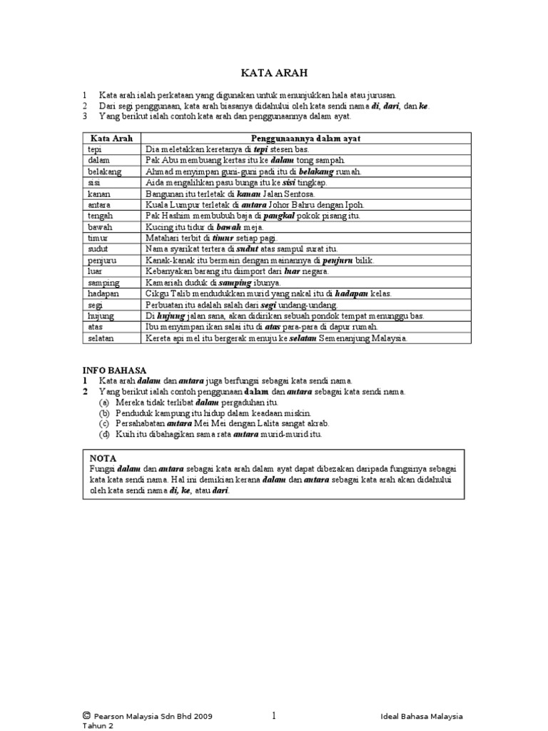 Contoh kata arah adalh seperti berikut. Kata nama khas kata nama yang secara khususnya digunakan untuk menyebut nama sesuatu benda sama ada benda yang bernyawa dan yang tidak bernyawa. Kata arah didahului oleh kata sendi nama dan diikuti oleh frasa nama. Nota ringkas bahasa melayu tahun 2.