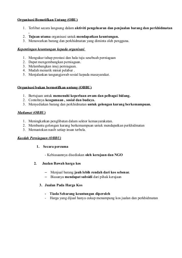 O merupakan organisasi seperti persatuan kelab dan badan amal o ditubuhkan untuk memenuhi keperluan awam o. I menyediakan perkhidmatan secara percuma ii memenuhi keperluan awam dalam pelbagai bidang iii menawarkan barang dan perkhidmatan kepada pengguna iv terlibat secara langsung dalam aktiviti pengeluaran dan penjualan barang dan perkhidmatan p. Nota ringkas perniagaan tingkatan 4 spm. Antara yang berikut manakah yang benar tentang organisasi bukan bermotifkan untung obbu.