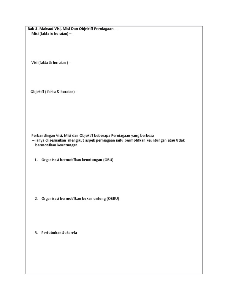 Apakah tujuan penubuhan organisasi bukan bermotifkan untung. Organisasi bukan bermotifkan untung obbu 1. Bertujuan untuk memenuhi keperluan awam dan pelbagai bidang. Unduh sebagai docx pdf txt atau baca online dari scribd.