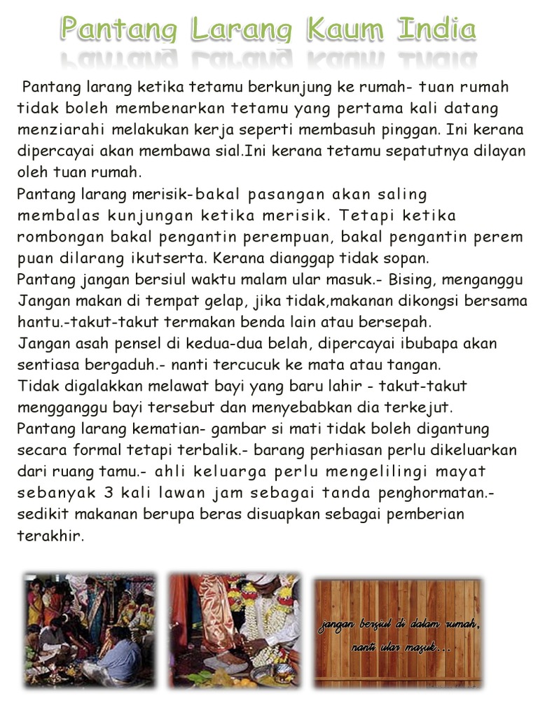 Pantang larang kaum india. Dalam masyarakat india mayat akan dibakar atau dikebumikan.