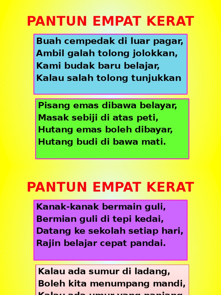 Pantun 2 kerat kanak kanak tadika. If you continue browsing the site you agree to the use of cookies on this website. Title slide of pantun 2 kerat slideshare uses cookies to improve functionality and performance and to provide you with relevant advertising. Pantun nasihat untuk kanak kanak hari ni kak mie nak kongsikan koleksi pantun nasihat untuk diajarkan kepada kanak kanak prasekolah. Ayam jantan patah taji mari dihantar ke pinggir kota sikap menolong patut dipuji menjadi pegangan hidup kita.