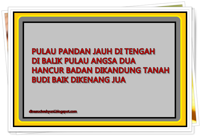 Tiada teraba tiada terlihat engkau di mana sukar dicari pulau pandan jauh ke kanan. Hancur badan dikandung tanah budi yang baik dikenang jua. 54 pulau pandan jauh ke tengah gunung daik bercabang dua.