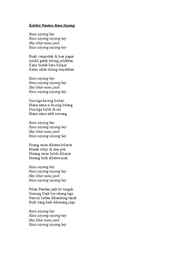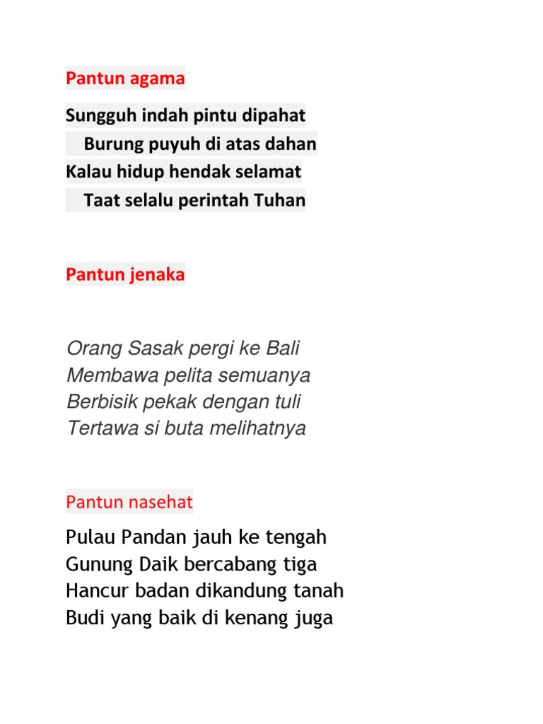 Hancur badan dikandung tanah budi yang baik dikenang jua. This is known to the french circle of 18th century high society as pantoum. Pulau pandan jauh ke tengah gunung daik bercabang tiga. Hampa badan hati pun gundah karena engkau tidak teraba pulau pandan kian merapat gunung kerinci menjulang tinggi.