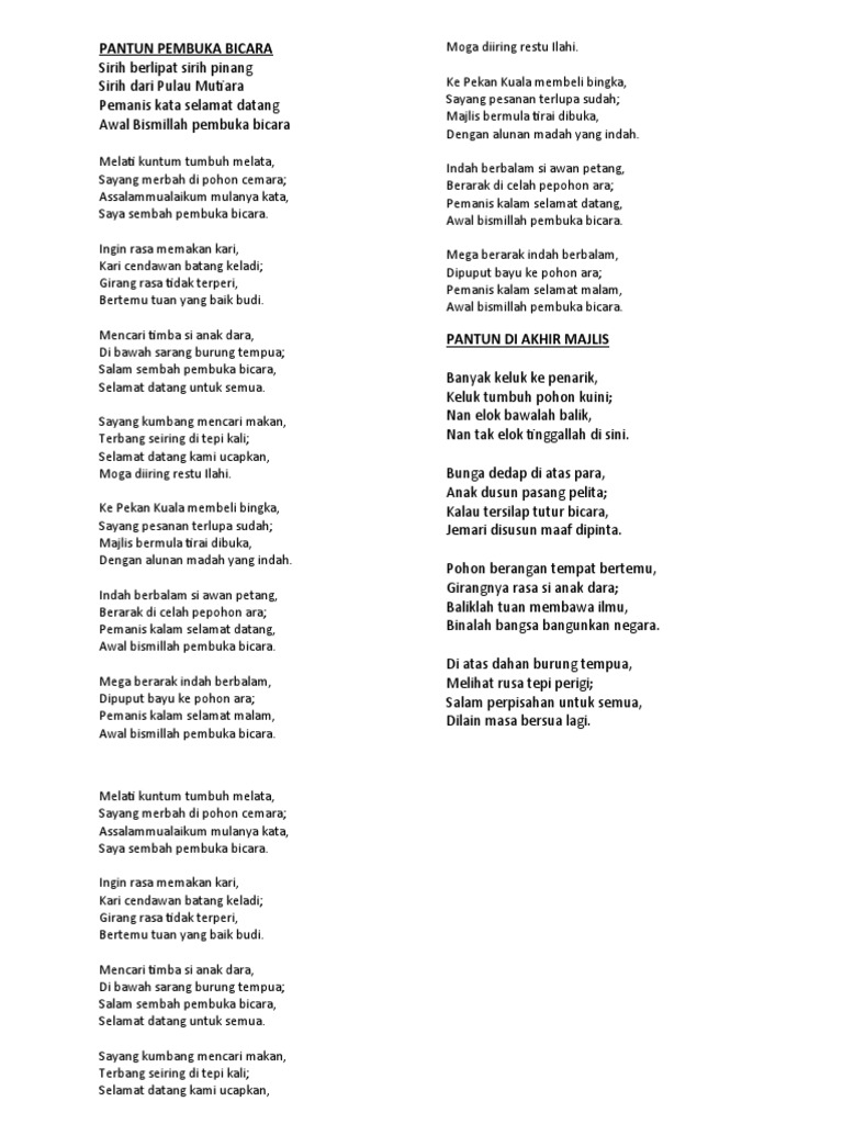 Pantun selamat datang ke majlis. Orang ke laut menjala udang petang hari pasang pelita yang ditunggu sudah pun datang yang dinanti sudah pun tiba. Salam sembah pembuka bicara selamat datang untuk semua. Koleksi pantun pengacara majlis koleksi pantun pengacara majlis sirih berlipat sirih pinang sirih dari pulau mutiara pemanis kata selamat datang awal bismillah pembuka bicara terbang rendah burung tempua hinggap berdua di dahan ara hidangan di meja sudah tersedia dijemput tuan menjamu selera jejaran mengkudu berbias kesuma di celah angsana di tanah jawa. Mencari timba si anak dara di bawah sarang burung tempua.