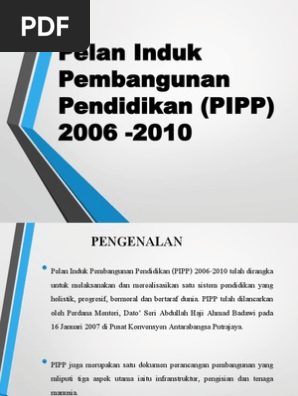 Pelan induk pembangunan pendidikan pipp 2006 2010 telah disempurnakan pelancarannya oleh y a b. Pelan induk pembangunan pendidikan pipp 2006 2010 yang akan dijadikan garis panduan pembangunan pendidikan negara secara menyeluruh bagi tempoh lima tahun untuk membangunkan sekolah kebangsaan sk sebagai aliran perdana tanpa meminggirkan sekolah aliran lain. Ahmad badawi pada 16 januari 2007 bersamaan 26 zulhijah 1427 di putrajaya international convention centre picc putrajaya. Justeru pelan induk pembangunan pendidikan pipp 2006 2010 telah dirangka untuk melaksanakan dan merealisasikan satu sistem pendidikan yang holistik progresif bermoral dan bertaraf dunia.