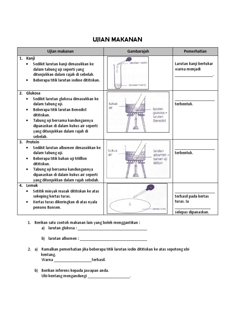 Ujian iodin adalah digunakan bagi menguji kehadiran kanji dalam sampel makanan. Bahan daun hijau alkohol larutan iodin air suling radas penunu bunsen tungku kaki tiga kasa dawai bikar 500ml tabung uji penitis forsep. Titiskan dengan iodin maka anda akan mendapat larutan biru kehitaman. Kanji boleh didapati dalam gandum beras ubi kentang roti dan jagung.