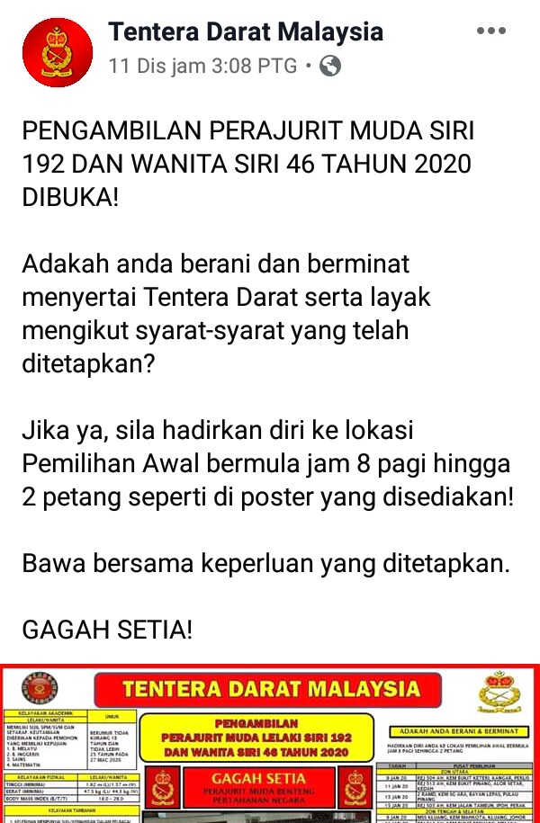 Peluang kerjaya dalam tentera darat pengambilan perajurit muda lelaki siri 193 2020 kini dibuka kepada seluruh rakyat malaysia yang berkelayakan dan menepati syarat yang telah ditetapkan dan berminat untuk menceburi profesion ketenteraan. Forward employment fe semasa pemilihan akhir. Fe semasa pemilihan akhir. Semakan nama bagi pemilihan akhir perajurit muda tentera darat siri 193 tahun 2021 01 09 2020 hari ulangtahun kor armor diraja kad 16 09 2020 hari ulang tahun angkatan tentera malaysia.