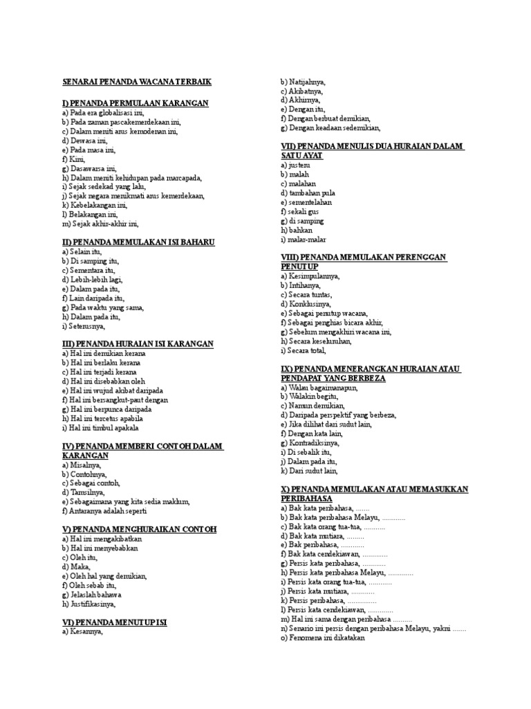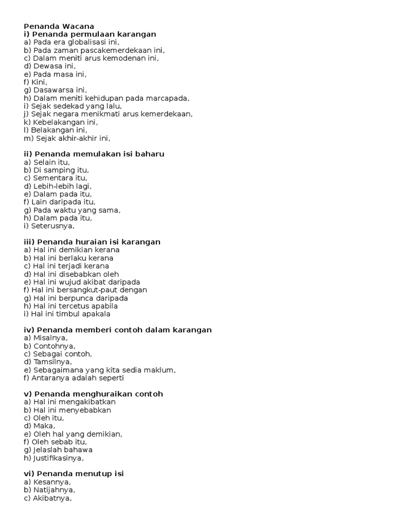 Jul 24 2017 list of discourse markers penanda wacana adding menambah and dan also juga as well as serta moreover tambahan pula too sangat juga furthermore. Pada waktu yang sama h. Penanda permulaan karangan a. Pada era globalisasi ini 2 dewasa ini 3 pada masa ini 4 baru baru ini 5.