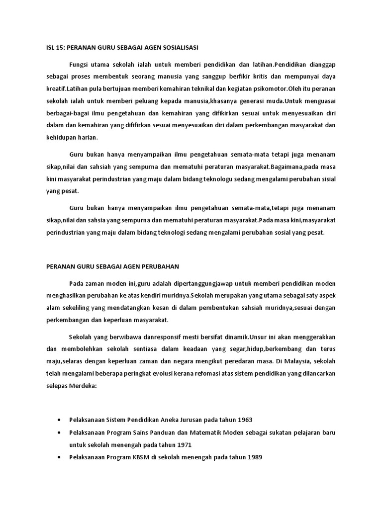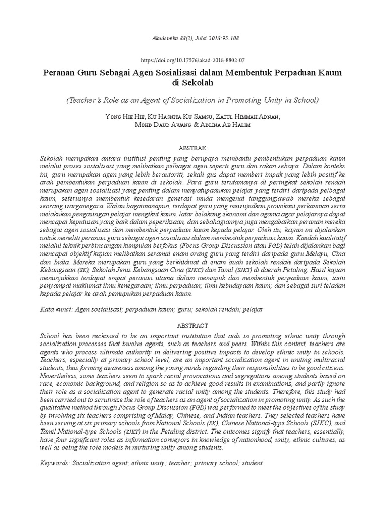 Juga beliau menganggapkan guru sebagai agen yang utama dan merupakan pertalian yang kritikal dalam proses pengaliran kebudayaan. Oleh itu kajian ini dijalankan untuk meneliti peranan guru sebagai agen sosialisasi dalam membentuk perpaduan kaum. Yong hie hie and ku hasnita ku samsu and zatul himmah adnan and mohd daud awang and adlina ab halim 2018 peranan guru sebagai agen sosialisasi dalam membentuk perpaduan kaum di sekolah. Melaluinya pelajar dididik supaya berakhlak berrnoral dan mengamalkan budaya hidup yang mumi.