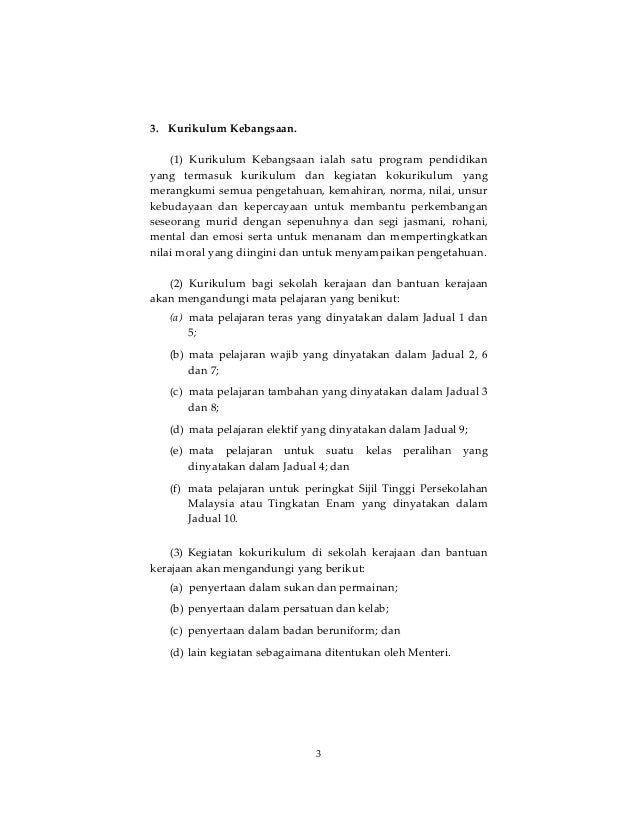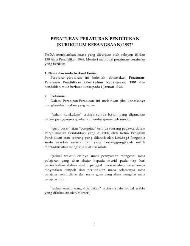 Peraturan peraturan pendidikan kurikulum kebangsaan 1997. Peraturan peraturan pendidikan kurikulum kebangsaan 1997 pada menjalankan kuasa yang diberikan oleh seksyen 18 dan 130 akta pendidikan 1996 menteri membuat peraturan peraturan yang berikut. Peraturan 2 pendidikan 1997 1. Dalam peraturan 6 7 8 9 dan 10. Guru adalah dianggap melakukan kesalahan mengikut peraturan ini jika disabitkan dengan peraturan peraturan ini.