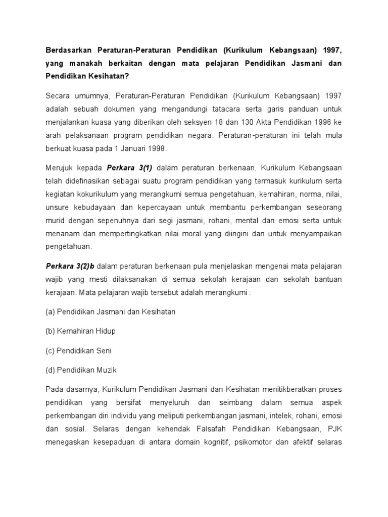 Peraturan peraturan ini bolehlah dinamakan peraturan peraturan pendidikan kurikulum kebangsaan 1997 dan hendaklah mula berkuat kuasa pada 1 januari 1998. Melaksanakan kokurikulum di sekolah adalah wajib. Nama dan mula berkuat kuasa. Subperaturan 3 1 peraturan peraturan pendidikan kurikulum kebangsaan 1997 yang diterbitkan sebagai pu a 531 97.