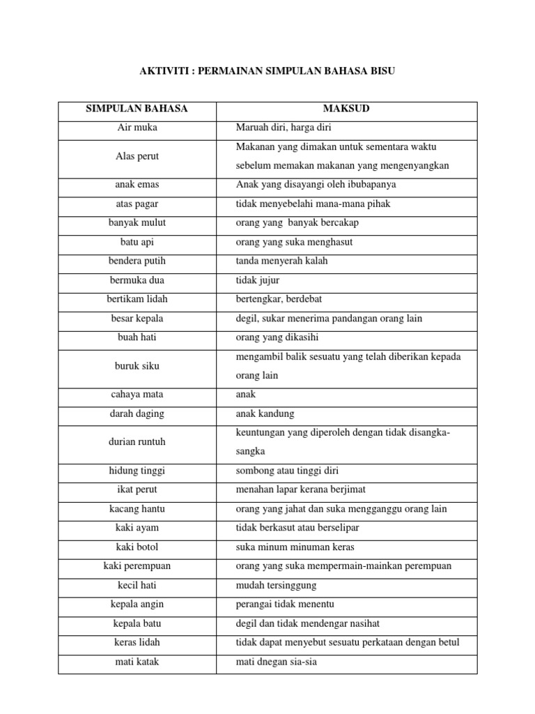 Dari segi pemberian markah penulisan karangan biasanya guru akan memberikan markah lebih jika anda memasukkan peribahasa di dalam karangan anda. Sehubungan dengan itu saya tertarik untuk berkongsi 15 jenis permainan bahasa berserta jawapannya yang disediakan oleh encik mohamed naim daipi yang boleh dilaksanakan dalam aktiviti pembelajaran dan pemudahcaraan pdpc. Mengerjakan sesuatu yang sukar hendaklah sabar sehingga mencapai kejayaan. Simpulan bahasa adalah salah satu daripada jenis peribahasa.