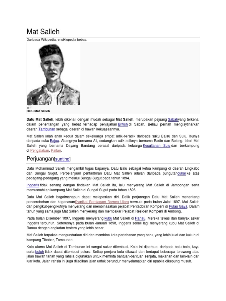 Peristiwa penentangan latar belakang mat salleh. Ii mereka menduduki kawasan pengaruh mat salleh dengan melaksanakan sistem cukai kepala dan surat perahu. Di tambunan sahaja kira kira 1000 orang dusun mati kerana membantu mat salleh terutamanya suku dusun tagahas belum dikira lagi perang suku antara dusun tagahas liwan yang dipicu oleh hasutan mat salleh agar suku tagahas menentang saudaranya sendiri suku. Academia edu is a platform for academics to share research papers. Mat salleh atau nama sebenarnya datu mat salleh merupakan pejuang sabah yang terkenal dalam memberi tentangan yang hebat kepada penjajahan inggeris di sabah.