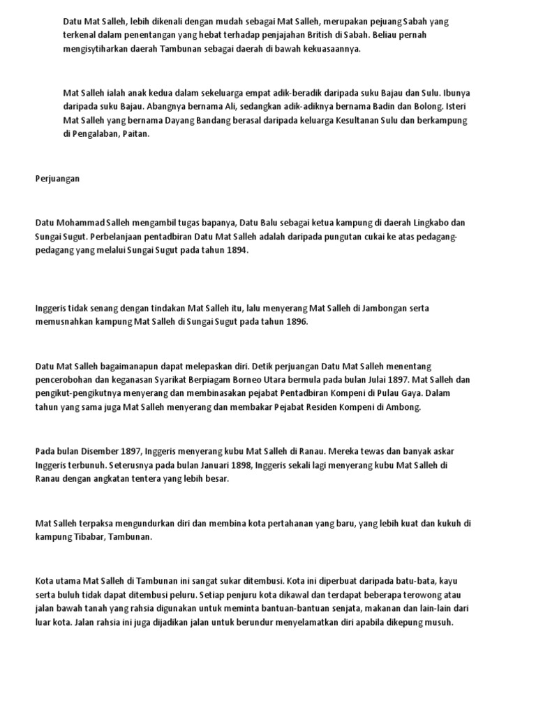 Teks ms 35 36 i sbub tidak menghiraukan kedudukan mat salleh sebagai pemerintah daerah tambunan dan sungai sugut. Datu paduka mohammad salleh bin datu balu dilahirkan di inanam sabah dan berketurunan bajau samah beliau memang terkenal dengan sifat kepahlawanan dan keberanian berperang. Sabihah osman datu paduka mat salleh pahlawan sabah hero of sabah 1894 1900 arkib negeri sabah kota kinabalu 2007 the new straits times 9 mar 2000.