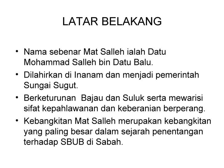 Peristiwa penentangan mat salleh terhadap british. Beliau membina kubu di ranau pada november 1897 beliau menyerang ambong pada 1898 cowie mengadakan rundingan dengan mat salleh di menggatal. Teks ms 35 36 i sbub tidak menghiraukan kedudukan mat salleh sebagai pemerintah daerah tambunan dan sungai sugut. Pernah mengisytiharkan daerah tambunan sebagai daerah di bawah kekuasaannya. Datu paduka mohammad salleh bin datu balu dilahirkan di inanam sabah dan berketurunan bajau samah beliau memang terkenal dengan sifat kepahlawanan dan keberanian berperang.