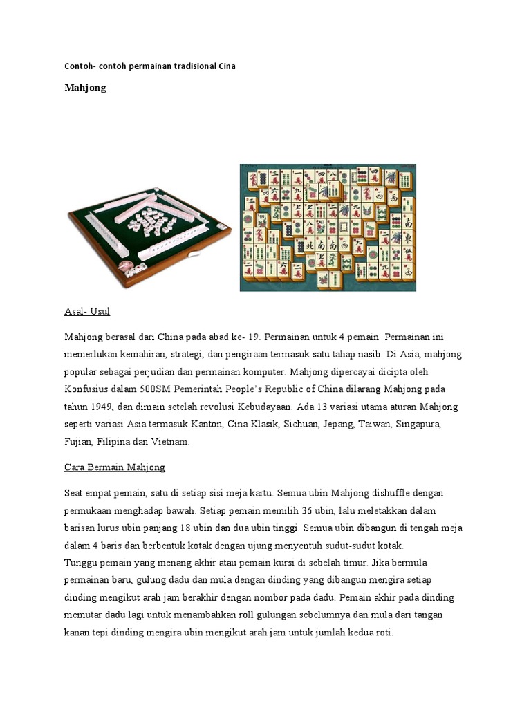 Mahjong atau mahjung merupakan permainan untuk empat orang yang berasal dari china. Xiangqi adalah sebuah permainan papan cina yang dimainkan oleh dua orang pemain. Mahjong mahjong atau mahjung yaitu permainan untuk empat orang yang datang dari china. Xiangqi berada dalam keluarga yang sama dengan catur.