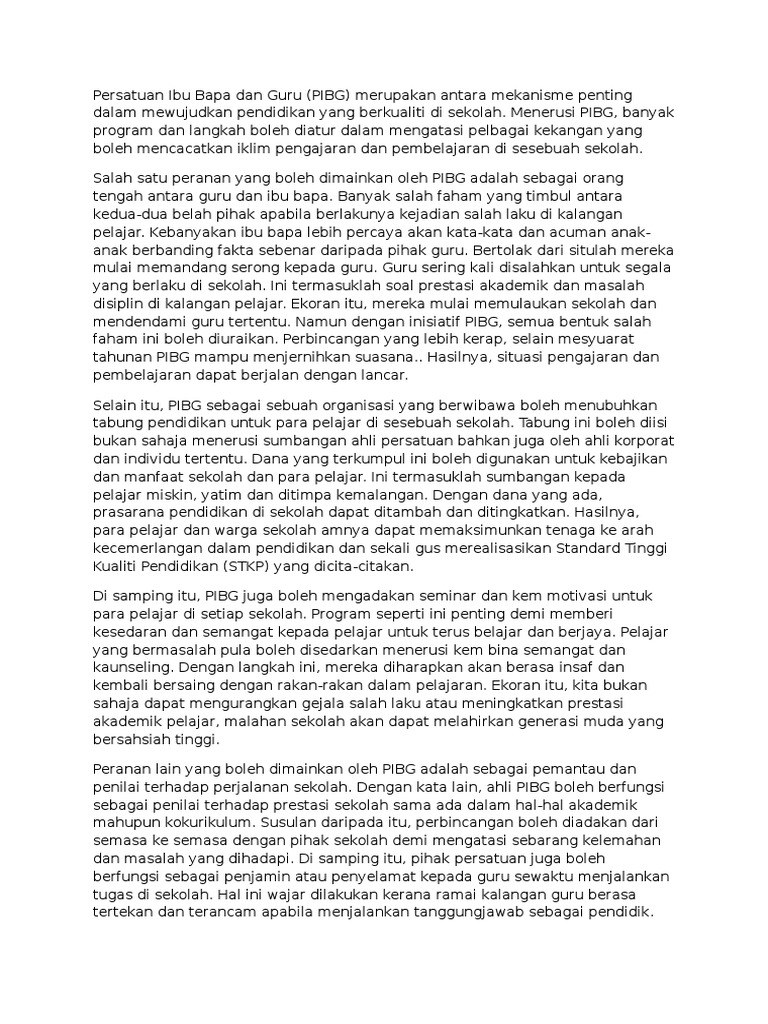 Kajian ini dijalankan untuk mengkaji peranan ibubapa dalam persatuan ibu bapa dan guru guru pibg sekolah jenis kebangsaan cina di kulai johor. Di rumah ibubapa mendidik anak anak mereka mengenai pembangunan sosial seperti adab dan sopan santun sebagai pembawaan diri bersama orang lain dan juga di khalayak orang ramai. Md khairul azad yunus jeffrey nian labuan labuan 17 nov malaysiaaktif permuafakatan antara ibu bapa dan guru menerusi persatuan ibu bapa dan guru pibg amat penting sebagai pendorong kemajuan serta kejayaan seseorang pelajar. Tertakluk kepada perenggan 13 perlembagaan ini dan subperaturan 6 4 hingga 6 peraturan peraturan pendidikan persatuan ibu bapa guru 1998 pegawai pendidikan daerah atau pegawai pendidikan bahagian mengikut mana yang berkenaan boleh melantik tidak lebih daripada 2 orang yang bukan anggota persatuan untuk menjadi anggota jawatankuasa pibg setelah mendapat kelulusan bertulis pendaftar.