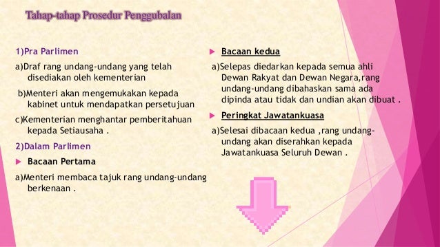 Konsep parlimen secara umum ialah jarak masa sesuatu kerajaan terbentuk mulai tarikh pilihanraya hingga ke suatu pilihanraya seterusnya manakala konsep parlimen secara khusus pula ialah parlimen merupakan badan perundangan tertinggi yang diberi kuasa menggubal dan. Posedur penggubalan undang undang dalam dewan undangan negeri. Proses penggubalan kelulusan undang undang adalah seperti berikut. A raja atau yang dipertua negeri b dewan undangan negeri raja atau yang dipertua negeri membuka menangguh dan.