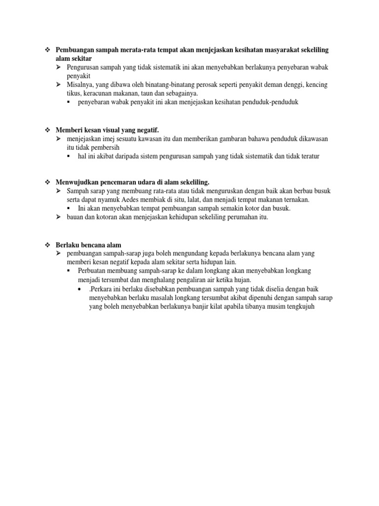 Pelaksanaan peraturan itu dipertahankan menteri besar dr ahmad samsuri mokhtar dengan berkata ia bertujuan memberi kesedaran kepada rakyat untuk bersama sama menjaga kebersihan sekitar pusat bandar raya. Hari ini kami akan kongsikan info tentang punca pembuangan sisa domestik kesannya serta langkah untuk mengatasi sebagai panduan kita bersama. Pembuangan sampah adalah salah satu punca pencemaran yang semakin serius pada alam sekeliling kita. Saya sebagai rakyat yang prihatin terhadap masalah sampah amat kecewa dengan sikap segelintir rakyat malaysia yang suka membuang sampah di merata rata.