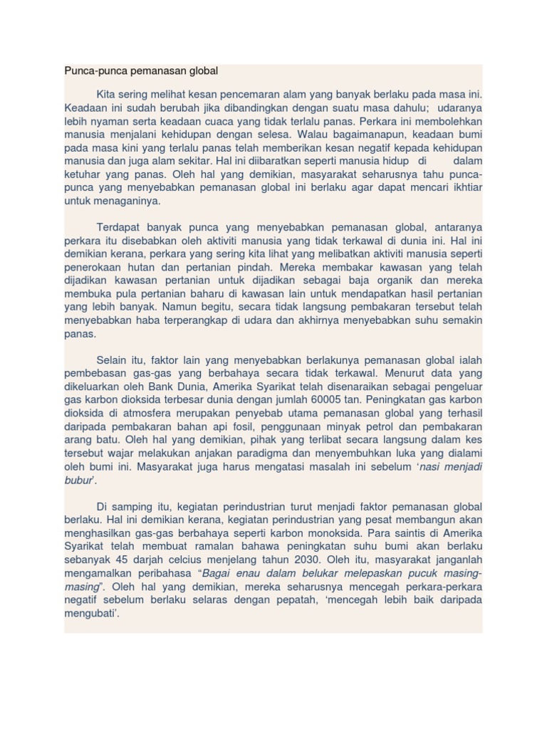 Punca punca pemanasan global 1. Pemanasan global dan kenaikan paras air laut merupakan bencana alam yang semakin mengancam ekosistem dan juga pembangunan manusia. Entri kali ini cik tom nak berkongsi mengenai pemanasan global atau global warming yang menjadi satu masalahalam sekitar yang serius dihadapi oleh masyarakat di seluruh dunia. Adakah anda mencari contoh karangan bahasa melayu untuk dijadikan rujukan.
