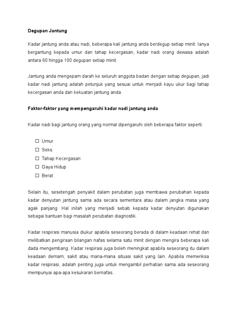 Pada orang dewasa angka ini adalah 60 80 denyutan seminit dan dalam sesetengah keadaan mungkin lebih tinggi misalnya pada wanita dan individu tanpa latihan fizikal atau lebih rendah. Dua cara untuk mengira denyutan nadi yang boleh dilakukan sendiri. Untuk mengukur kadar degupan jantung kita boleh periksa melalui denyutan nadi samada di leher atau di pergelangan tangan. Ketika bersenam kadar denyutan jantung akan naik.