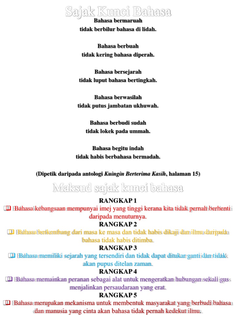 Sajak kunci bahasa. 7494 hits maksud sajak tema persoalan bentuk gaya bahasa nilai pengajaran sila klik maksud sajak tema persoalan bentuk gaya bahasa nilai pengajaran juga klik sajak kunci bahasa bahasa melayu novel novel tingkatan 1 2 3 bahasa melayu tingkatan 1 2 3 c. Maksud sajak tema persoalan bentuk gaya bahasa nilai pengajaran sajak kunci bahasa k2 komponen sastera dan novel bm bahasa melayu. Maksud rangkap 1 bahasa yang bermaruah tidak akan diucapkan oleh lidah dengan bahasa yang tidak sopan.