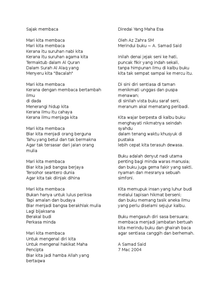 Sajak membaca jambatan ilmu. Walau ajal menjemput tak kenal kata menyerah untuk belajar. Samad said inilah denai jejak seni ke hati. Oleh itu membaca merupakan jambatan ilmu. Salah satunya adalah membaca dengan membaca maka pengetahuan bertambah.