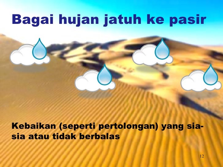 Peribahasa melayu yang paling popular setiap hari. Bagai hujan jatuh ke pasir kebaikan seperti pertolongan yang sia sia atau tidak berbalas 6. Nasihat daripada rakan rakannya itu langsung tidak dihargainya seperti hujan jatuh ke pasir seperti api dalam sekam 3. Nasihat yang tidak dihargai atau sesuatu kerja yang sia sia.