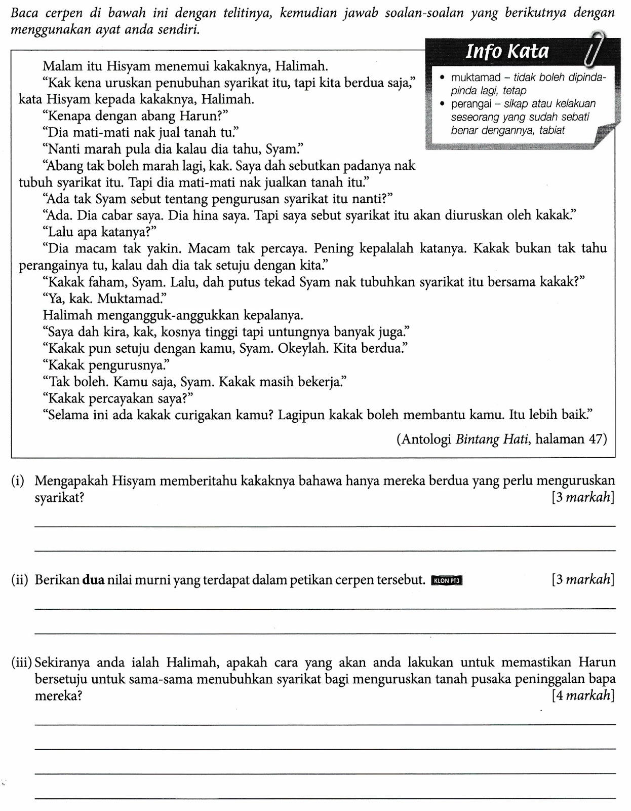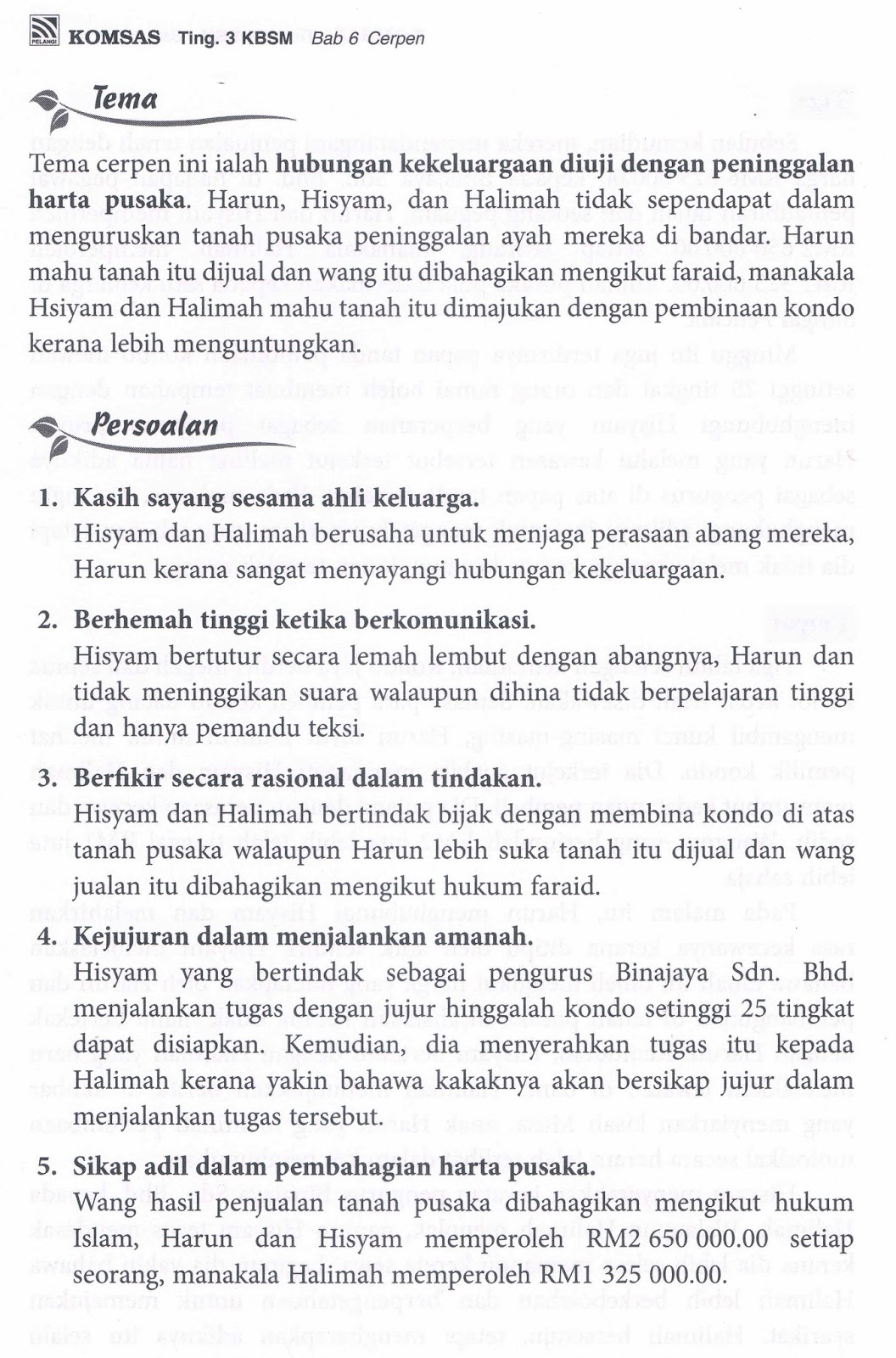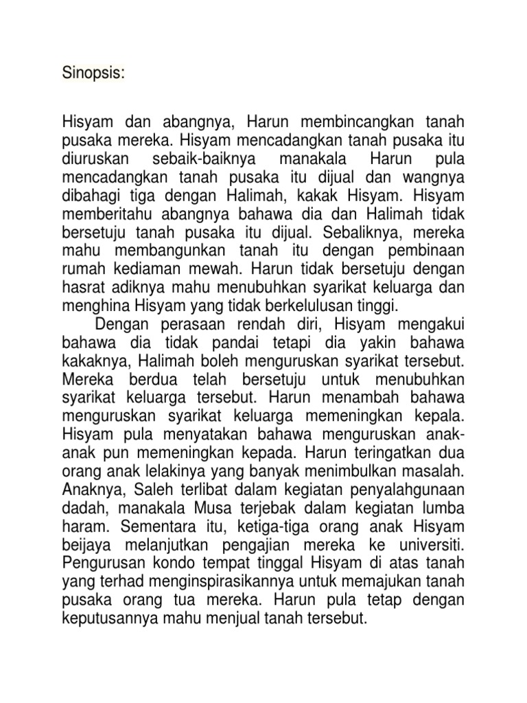 Semoga perkongsian nota nota rujukan bahasa melayu contoh contoh karangan bahan bahan pembelajaran dan pengajaran pt3 pentaksiran tingkatan 3 tingkatan 1 tingkatan 2 tingkatan 3 dalam post di blog bumi gemilang berguna dan dapat membantu. Menurut hisyam dia bercadang untuk membangunkan tanah pusaka peninggalan arwah ayahnya di bandar itu kerana kakaknya halimah juga bersetuju dengan cadangannya. Hisyam dan abangnya harun membincangkan tanah pusaka mereka. Lihat sinopsis tema latar masa latar tempat latar masyarakat nilai gaya bahasa contoh soalan dan banyak lagi.