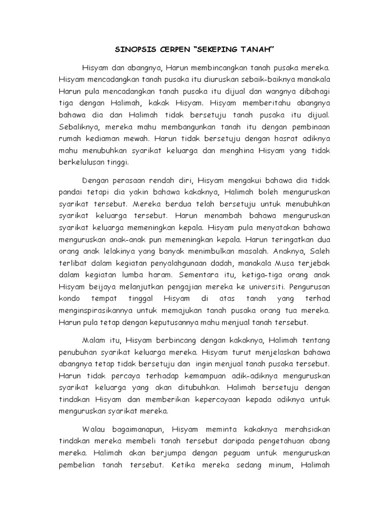 Sinopsis cerpen sekeping tanah. Sinopsis tema watak dan perwatakan cerpen sekeping tanah k komsas bahasa melayu tingkatan 3. Antologi bintang hati tingkatan 3 cerpen sekeping tanah sinopsis. Kumpulan karya inovatif ini merupakan refleksi imajinatif para guru dan siswa sesuai dengan kemampuan seni yang dimiliki. Syair burung nuri warkah surat rencana 计划 ikatan 绑着 fakir miskin 贫穷 hina rendah低贱 taraf水平 kedudukan地位 pangkat阶级 keji 卑贱.