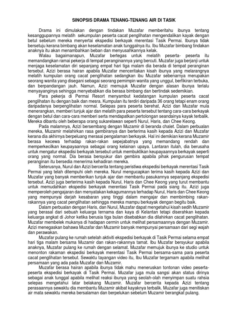 Tenang tenang air di tasik norhashimah hashim drama ini dimulakan dengan tindakan muzafar memberitahu ibunya tentang kesanggupannya melatih sekumpulan peserta cacat penglihatan mengendalikan kayak dengan betul sebelum mereka menyertai ekspedisi berkayak merentasi tasik permai. Tenang tenang air di tasik sinopsis kupasan 1 kupasan 2 latihan 1 latihan 2. Drama tenang tenang di air tasik dicatat oleh cikgu simile di 10 57 pg. Komponen sastera dan novel bm bahasa melayu.