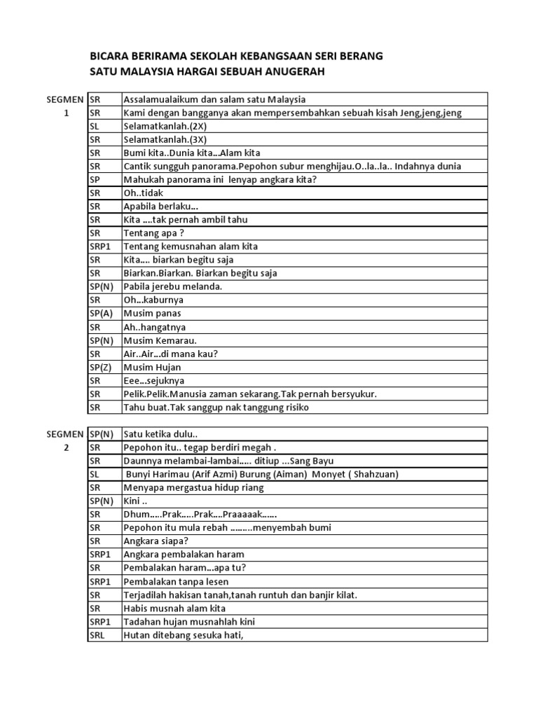Nak karang skrip ni susah jugaklah bagi aku sebab unsur kecindan lucu itu yang susah nak letak. Pasukan bicara berirama sk seri berang berjaya mengekalkan kejuaraan apabila sekali lagi dinobatkan johan pertandingan bicara berirama sekolah rendah peringkat daerah hulu terengganu. Skrip bicara berirama memelihara dan memulihara alam sekitar segmen 1 murid dalam pengembaraan menjelajah alam untuk misi memelihara dan memulihara alam. Salam sejahtera salam bahagia salam satu malaysia.