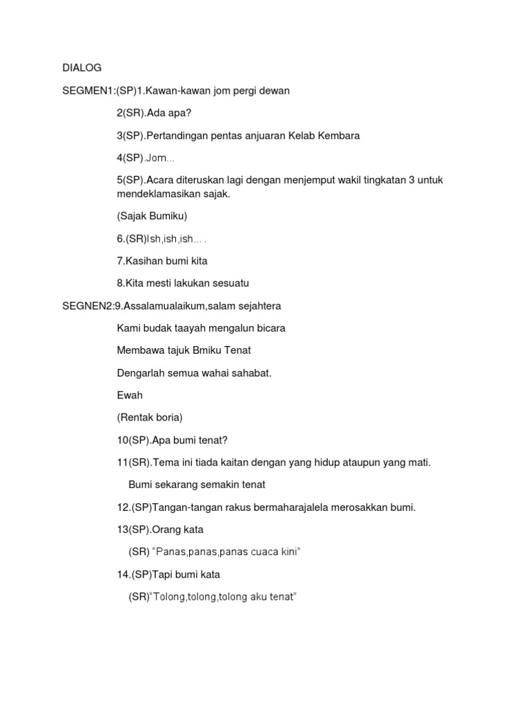 Mari kita dengarkan ramai 7. Idea memang idea lapuk pasal alam sekitar malu weh dengan orang lain yang ada idea best best dan fresh. Ini skrip bicara berirama yang sekolah aku guna tahun lepas. Peserta masuk dan membuat formasi pergerakkan 2.