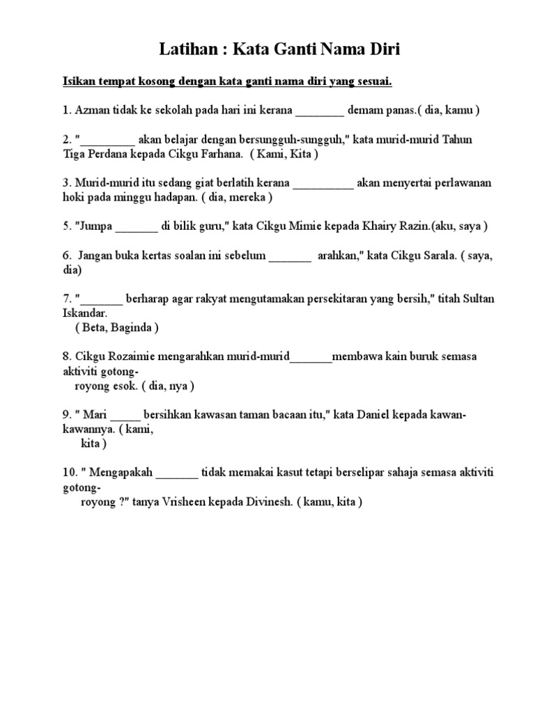 Azman tidak ke sekolah pada hari ini kerana demam panas dia kamu 2. Kata ganti nama diri singkat 1. Kata ganti nama diri isikan tempat kosong dengan kata ganti nama diri yang sesuai. Latihan kata ganti nama diri gariskan kata ganti nama yang betul dalam kurungan pada ayat ayat di bawah.