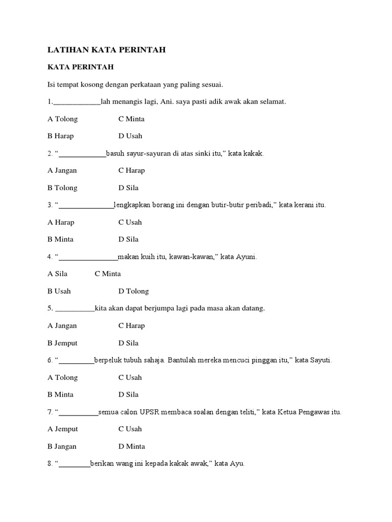 Latihan kata perintah kata perintah. Koleksi soalan ujian mac tahun 1 k. Bahasa melayu bm bahasa inggeris english matematik mathematics sains science bahasa cina. Semua calon upsr membaca soalan dengan teliti kata ketua pengawas itu.