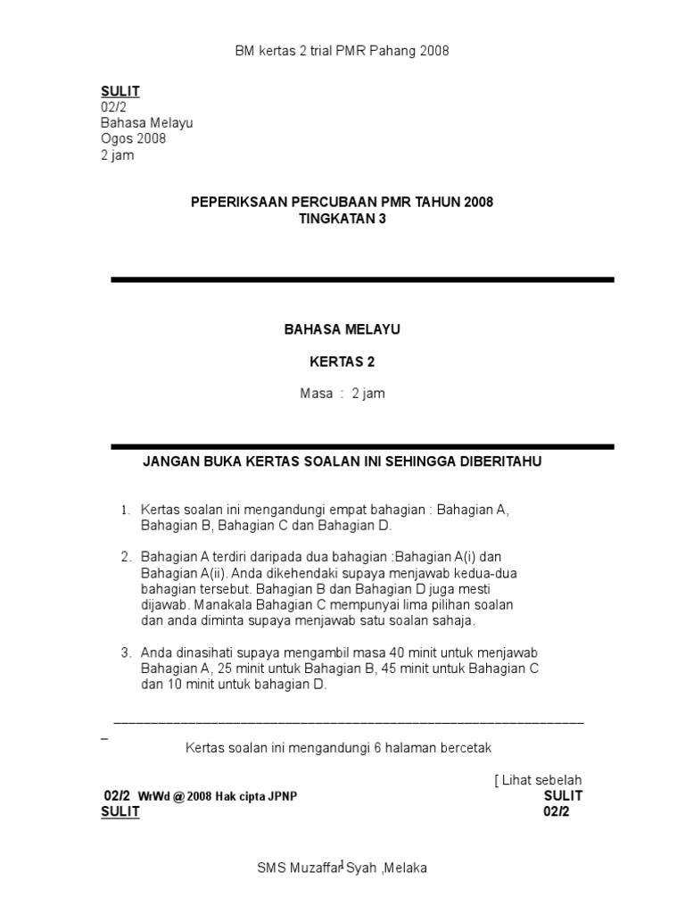 Soalan percubaan pmr 2009 02 bahasa melayu kertas 1 kertas 2 12 bahasa inggeris kertas 1 kertas 2 skema 21 sejarah 23 geografi skema 45 pendidikan islam 50 matematik. 2 calon harus bersedia untuk ketiga tiga novel yang dipelajari semasa di tingkatan 1 ii dan iii kehendak soalan 1 pelajar dinasihatkan membaca soalan dengan teliti bagi menentukan novel yang perlu dipilih. Semoga perkongsian soalan soalan peperiksaan percubaan pmr penilaian menengah rendah panduan bahan rujukan sumber rujukan dalam post di blog bumi gemilang berguna dan dapat membantu para pelajar. Kedah bm1 dan bm2 skema 3.