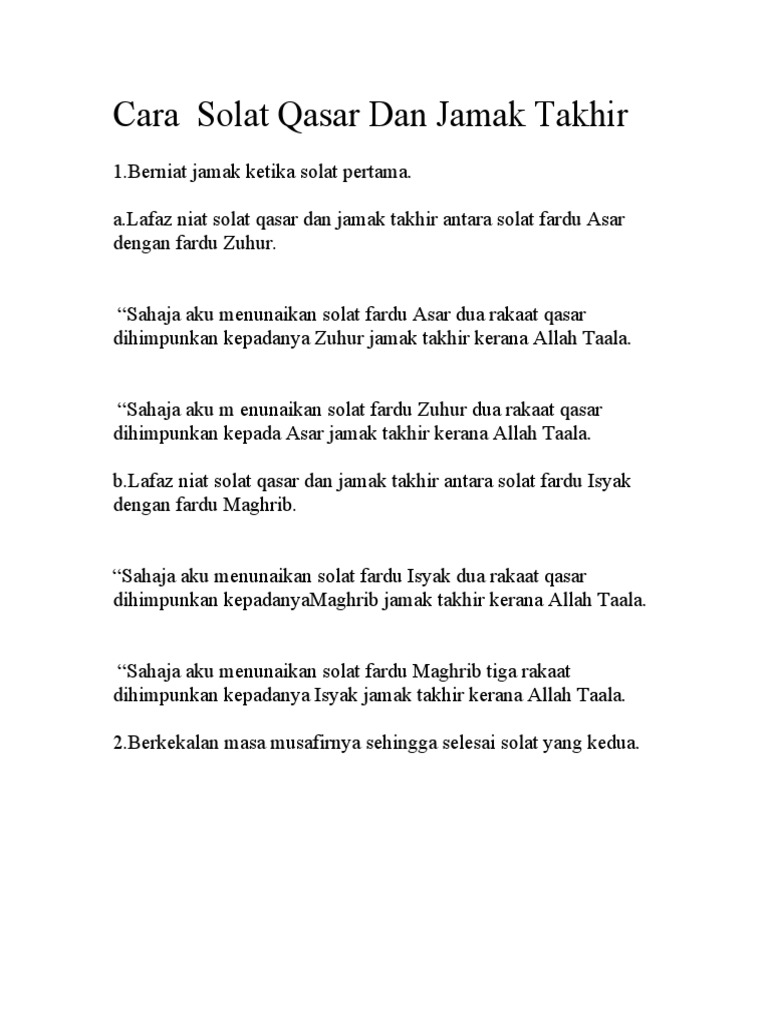 Sahaja aku solat fardhu maghrib tiga rakaat dihimpunkan kepadanya isyak tunai kerana allah taala maksudnya. Solat zuhur dengan asar. Walaupun sama sama menggunakan lafadz jamak takhir atau sebaliknya jamak takdim ada perbedaan lain dalam lafadznya ialah menggunakan lafadz arab bil atau ilaa. Jika jamak takhir berserta qasar contoh niatnya adalah seperti di bawah.