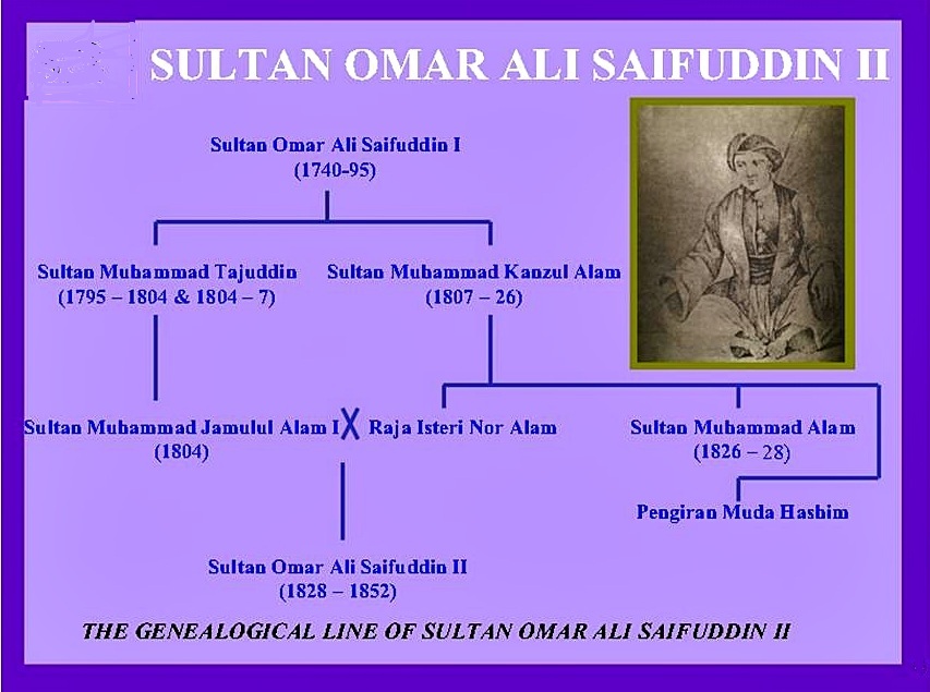 Sultan omar ali saifuddin ii. Pengiran muda omar ali saifuddien was born at istana kota kampong sultan lama brunei town on 3 zulkaedah 1332 hijrah corresponding to 23 september 1914 he was the second of ten children of muhammad jamalul alam ii and raja isteri fatimah. In 1842 sultan omar ali saifuddin ii appointed james brooke who succeeded in crushing the disturbances as the sultan representative governor in sarawak. Omar ali saifuddin ii 3 february 1799 20 november 1852 was the 23rd sultan of brunei then known as the bruneian empire during his reign western powers such as great britain and the united states visited the country. About sultan omar ali saifuddin ii sultan brunei ke 24 1822 1852 1822 1852 h h.