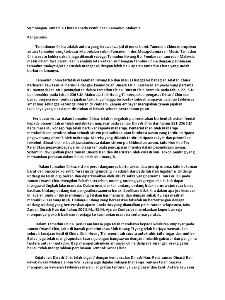 Sumbangan maharaja shih huang ti kepada tamadun china. Sumbangan tamadun kepada dunia hari ini. Raja yang kini dikenali sebagai chin shi atau shih huang ti 259 sm 10 september 210 sm nama peribadi yíng zhèng ialah raja negeri chin dari 247 sm hingga 221 sm secara rasminya masih di bawah naungan dinasti chou dan kemudiannya maharaja pertama china yang disatukan mulai 221 sm hingga 210 sm yang memerintah dengan gelaran maharaja pertama bahasa cina. Maharaja shih huang ti memperluaskan empayar hingga ke sg. Sebagai contohnya gerakan penyatuan china yang dilakukan oleh shih huang ti menjelaskan bagaimana beliau ingin mengadakan satu sistem sukat ukur dan timbang yang standard bagi china.