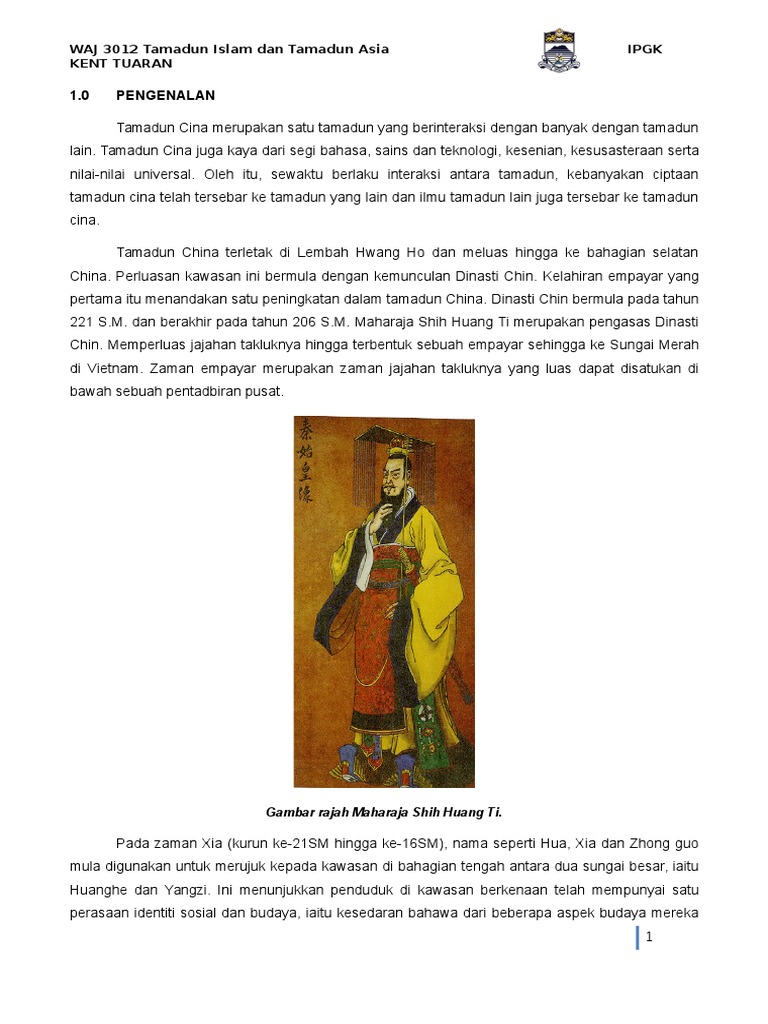 Sumbangan maharaja shih huang ti terhadap tamadun china. Di negeri lu di shantung. Perluasan kawasan ini bermula dengan kemunculan dinasti chin. Sistem pengairan ini diteruskan pada zaman chin oleh shih huang ti ke kawasan barat daya china. Dinasti chin bermula pada tahun 221 s m dan berakhir pada tahun 206 s m maharaja shih huang ti merupakan pengasas.