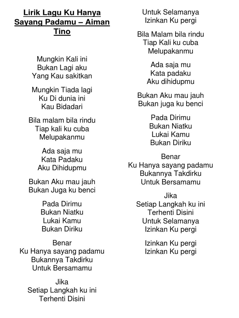 Jangan pernah kau ragukan cinta yang sesungguhnya itu bisa menghancurkan semua bukan begitu. Berikut cuplikan syair nyanyian teks lagunya jangan sampai kau meninggalkan aku sungguh ku berharap kau pun begitu padaku coba kau rasakan cinta yang begitu kan mengesankan single lainnya dari st12 di antaranya jangan marah marah rama dan shinta 1. Ku hanya sayang padamu lyrics. Lirik lagu sehati sejiwa lagu tema hari kemerdekaan.