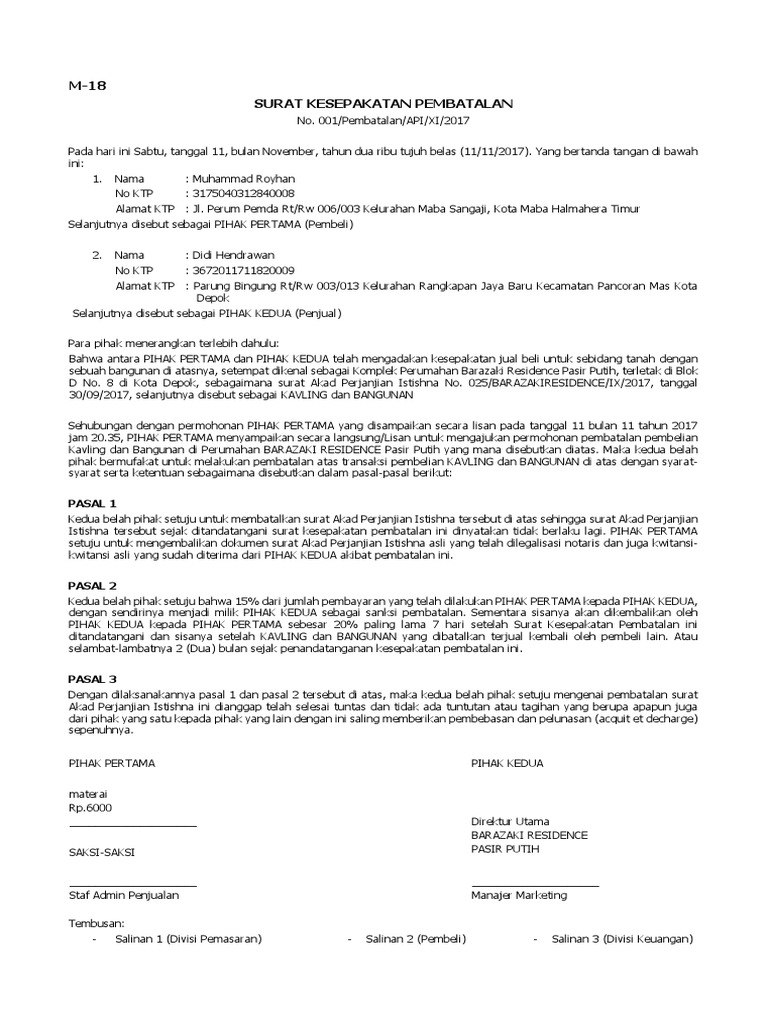 Anda dapat melihat dengan jelas contoh surat pernyataan pembatalan menggunakan desktop anda tablet android atau iphone dan perangkat smartphone lainnya secara gratis. Pembatalan tersebut disebabkan karena perbedaan yang cukup signifikan antara bentuk dan ukuran kavling tanah pada saat pemesan awal luas tanah 142 m2 lebar 9 9 m dan panjang 15 9 m dengan kondisi saat ini di lapangan luas tanah 108 m2 lebar 7 7 m dan panjang 15 2 m denah awal dan akhir serta surat pemesanan rumah terlampir. Sertifikat bisa diambil di pihak penitipan dengan membawa surat tanda bukti lunas dari pihak developer.