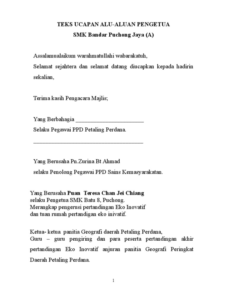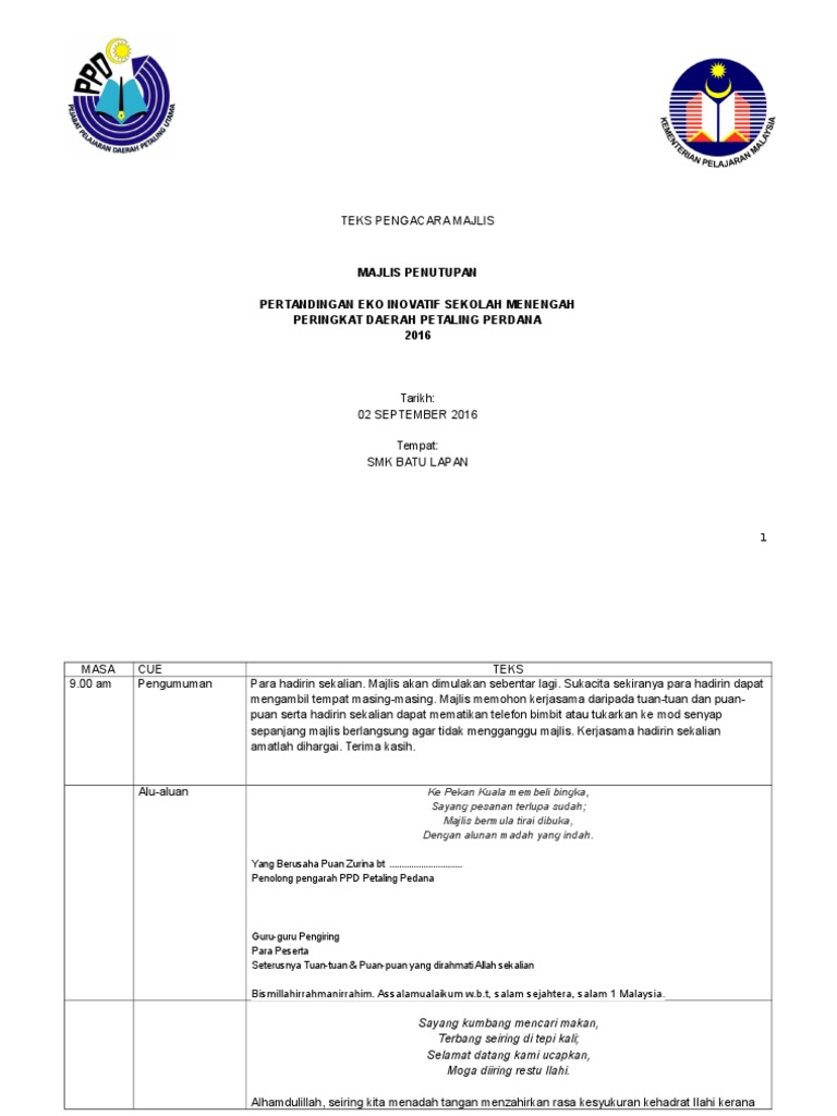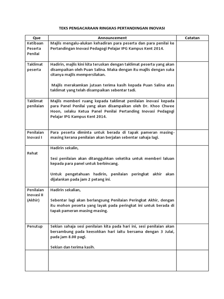 Teks pengacara majlis pertandingan inovasi. Majlis dengan sukacitanya memaklumkan bahawa sjk telah dipilih sebagai johan keseluruhan pertandingan syarahan dan ujian bertulis bahasa malaysia kumpulan kerjasama bagi tahun 2017. Contoh teks ucapan pengacara majlis majlis mengumumkan ketibaaan yang berbahagia prof. Pertandingan nyanyian lagu asli. Teks pengacara majlis pidatomembawakan dari auditorium seri perdana pertandingan pidato peringkat daerah jasin melaka bandaraya bersejarah asalamualamualikum.