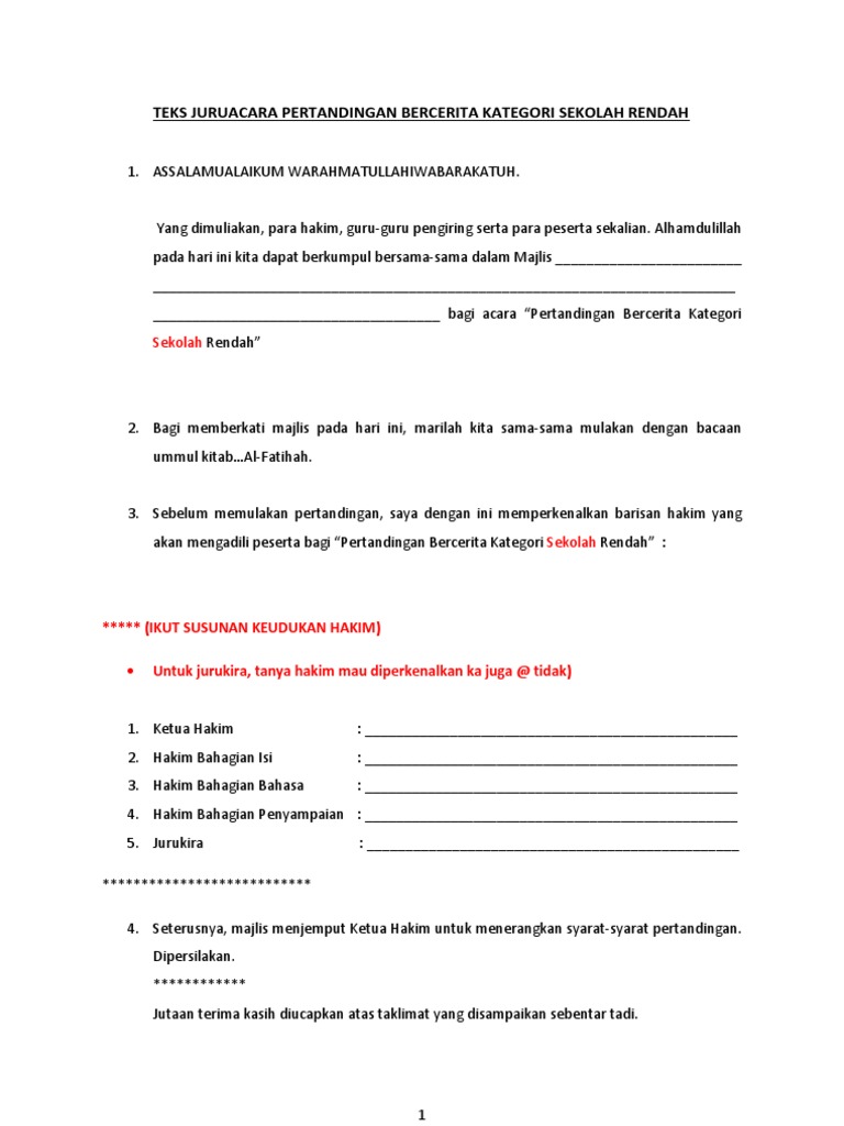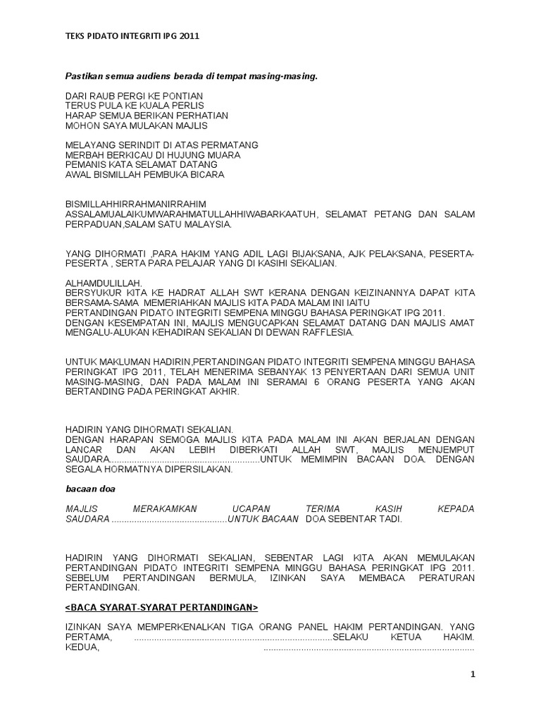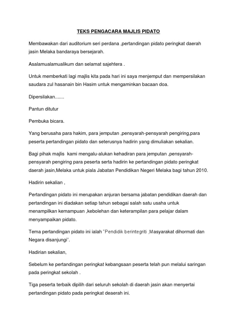 Teks pengacara majlis pertandingan pidato. Teks pertandingan pidato piala diraja. Majlis dengan sukacitanya memaklumkan bahawa sjk telah dipilih sebagai johan keseluruhan pertandingan syarahan dan ujian bertulis bahasa malaysia kumpulan kerjasama bagi tahun 2017. Pertandingan pidato ini merupakan anjuran bersama jabatan pendidikan daerah dan pertandingan ini diadakan setiap tahun sebagai salah satu usaha untuk menampilkan kemampuan kebolehan dan keterampilan para pelajar dalam menyampaikan pidato. Mengumumkan ketibaan yang berhormat datuk hj daud abdul rahman menteri muda hal ehwal islam di pejabat ketua menteri sarawak.