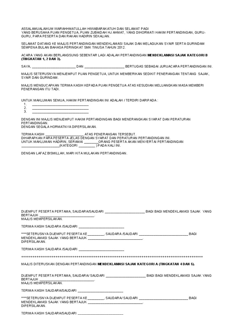 Pertandingan deklamasi sajak pertandingan esei bahasa inggeris pertandingan kaligrafi cina pertandingan esei bahasa tamil poem recitation tongue twister eksplorace pertandingan lukisan poster pertandingan gubahan bunga dan pertandingan folio berkomputer. Saya bukan orang yang mencari duit dengan membina blog hanya mengharapkan apa yang saya buat dapat membantu guru guru yang menjadi pengacara majlis. Atas permintaan sahabat sahabat diturunkan contoh skrip pengacara majlis sebuah pertandingan puisi yang pernah disediakan untuk kendalian pelajar. Teks ucapan pengacara hari kejohanan balapan dan padang skkb rashadah melati kuntum tumbuh melata.