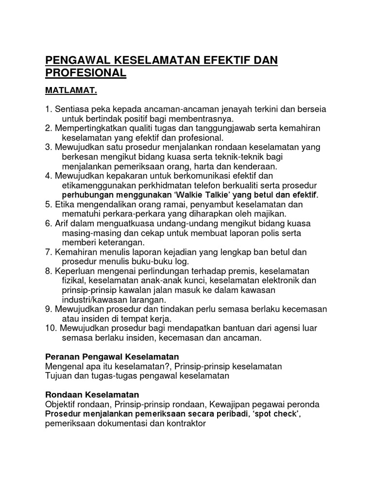 Di samping itu mereka membantu menaikkan imej organisasi kepada pelanggan dan memberi keselesaan kepada pekerja majikan supaya dapat menjalankan aktiviti harian seperti biasa. Deskripsi tugas bertanggungjawab melaksanakan tugas kawalan keselamatan aset kerajaan melibatkan keselamatan fizikal dokumen dan personel di bangunan dan premis kerajaan termasuk kawasan kawasan yang diisytiharkan sebagai kawasan larangan dan tempat larangan di bawah akta kawasan larangan dan tempat larangan 1959 akta 298. Menempatkan pengawal keselamatan penjaga sekolah bagi mengawasi pelajar pelajar semasa datang dan balik. Ii memastikan pengawal keselamatan berkawal di tempat pondok keselamatan bagi mengawal keluar masuk kenderaan ke sekolah.
