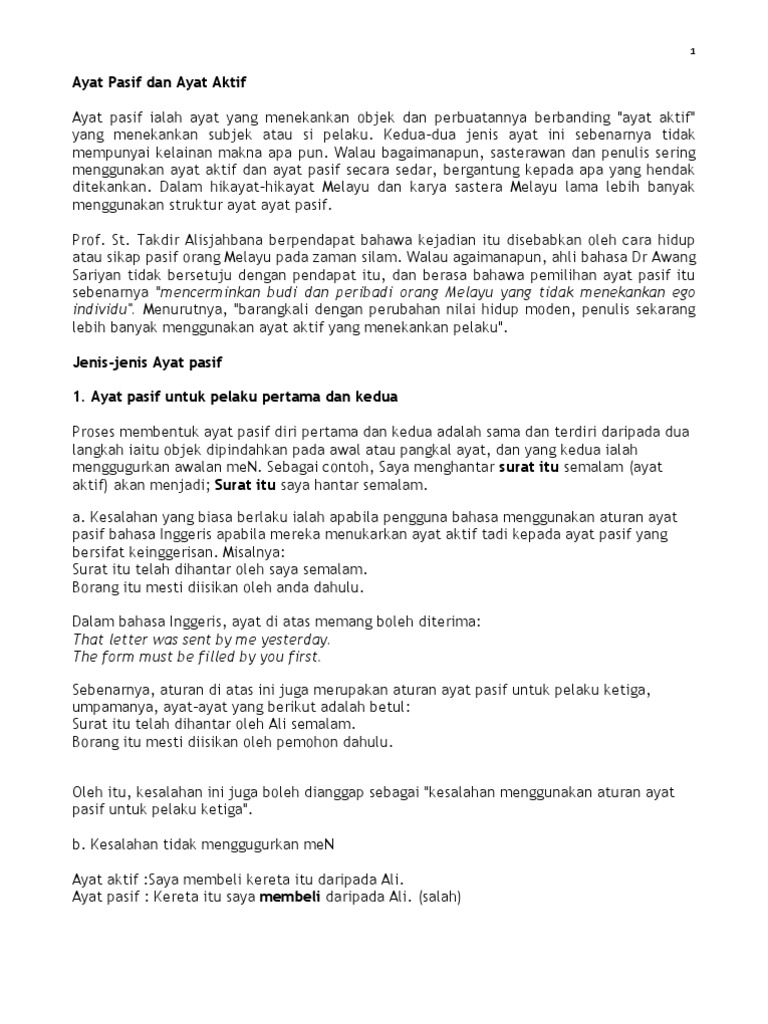 Kesalahan yang biasa berlaku ialah apabila pengguna bahasa menggunakan aturan ayat pasif bahasa inggeris apabila mereka menukarkan ayat aktif tadi kepada ayat pasif yang bersifat keinggerisan. Tukarkan ayat ayat pasif berikut kepada ayat aktif. Tq very much saya memahami bagaimana nk tukar ayat aktif kpd ayat pasif sangat senang. Walaupun ada terjemahan usahakan untuk tidak melihat terjemahan.