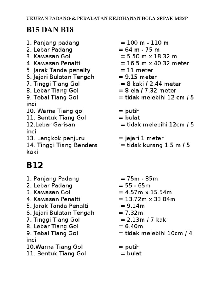 Klik untuk download gambar rajah. Untuk ukuran tiang gawang sendiri memiliki perbandingan 3 2 berbentuk persegi panjang. 4 4 kejadian di. Ukuran padang permainan bola sepak bagi umur bawah 12 tahun standard mssm 1 panjang padang.