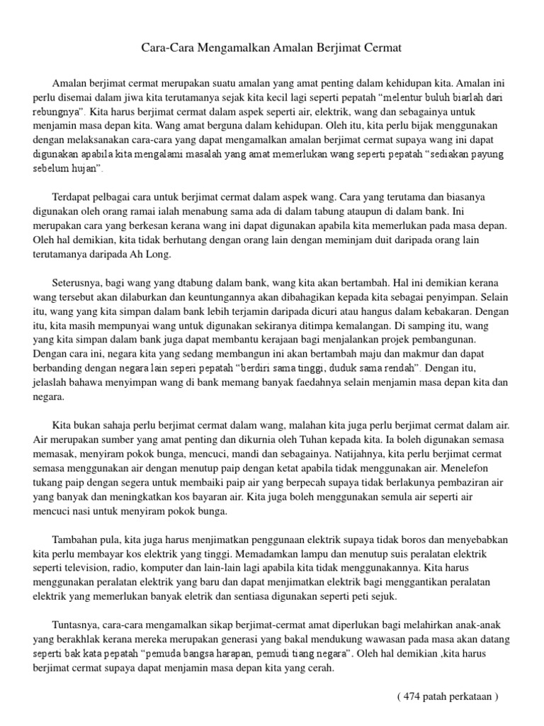Amalan ini perlu disemai dalam jiwa kita terutamanya sejak kita kecil lagi seperti pepatah melentur buluh biarlah dari rebungnya. Jadi adalah penting bagi saya dan juga anda sendiri perlu sentiasa berjimat cermat supaya kita dapat mengawal.